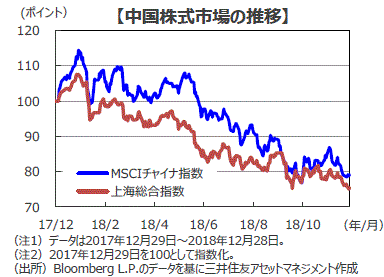 ■2018年の中国株式市場は年初こそ上昇して始まったものの、その後は中国国内のデレバレッジ(債務削減)に伴う景気の下押し圧力などから上値が重い展開となりました。さらに、米中貿易摩擦が一段と激化するにつれ、景気の減速と共に下げ足を速めました。代表的な株価指数の上海総合指数は年間で20%を超える下落となりました。