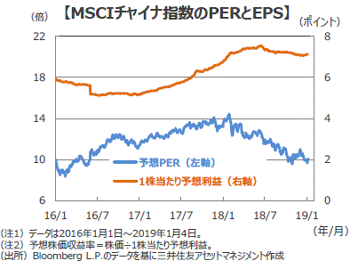 ■一方、株式市場は米中貿易摩擦激化に伴う景気減速はある程度織り込んだとみられます。株価下落に伴い、MSCIチャイナ指数の予想PER(株価収益率)は10倍程度と割安圏にあります。また、予想EPS(1株当たり利益)は下げ止まりつつあります。