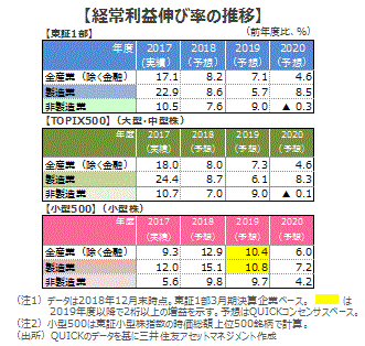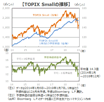 ■米中貿易摩擦や中国経済の減速、また、足元の円高が2019年1-3月期の決算に悪影響を及ぼす可能性があります。業績のモメンタムの回復は春以降と思われ、時間がかかりそうです。しかし、小型株の2019年度の経常利益は引き続き製造業を中心に2桁の伸びが予想されています。小型株は相対的に高い利益成長が株価を支えると期待されます。