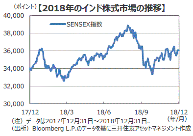 ■2018年のインド株式市場は、世界株安を受けて春先にかけて調整しましたが、その後は、力強い景気を背景に上昇基調が続き、8月下旬に過去最高値をつけました。しかし、通貨ルピー安や信用不安の高まりから、10月下旬にかけて下落し、11月以降はルピー反発に伴い持ち直しました。2018年は、米中貿易摩擦の激化でアジアの株式市場が軒並み大きく下落するなかで、インドの代表的な株価指数のSENSEX指数は5%を超える上昇となりました。