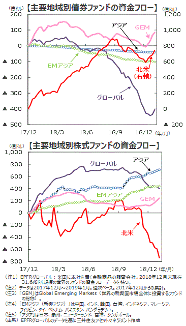 ■債券ファンドの内訳を見ると、「北米」が+154億ドルですが、新興国市場全体に投資する「GEM(注3)」が+90億ドルとなりました。世界的に金利先高観が低下する中で債券ファンドへの資金流入が大幅に増加しました。