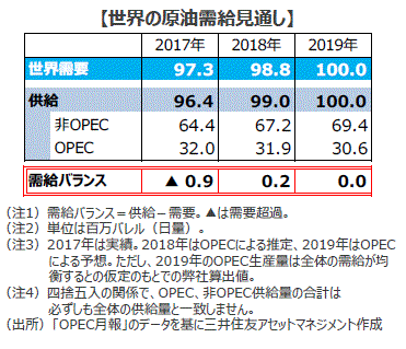 ■同OPEC月報によれば、2019年の原油需要見通しは、全世界推計で前年比+1.3%の日量1億バレルと予想されています。OPEC加盟国の産油量が現状程度で維持されれば、今年の需給はバランスする見込みです。しかし、米国はベネズエラに対して経済制裁を発動しており、同国の生産量が減少することにより、需給がタイト化する恐れがあります。