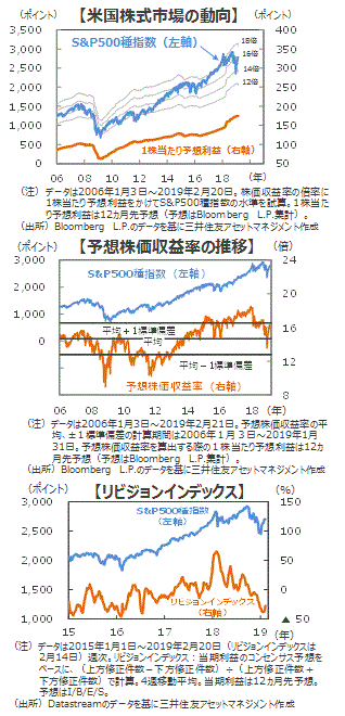 ■2月20日のS&P500種指数の予想株価収益率は16.3倍で、2006年以降の平均+1標準偏差である16.5倍と同水準となっています。これまでの株価上昇でやや割高感が現れており、今後は上値の重い展開となる可能性があります。企業業績の勢い(モメンタム)を見るリビジョンインデックスも底をつけ改善方向にあることから、今後は業績モメンタムにも注目する必要がありそうです。