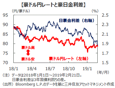 ■RBAの四半期金融政策報告で経済見通しが引き下げられましたが、これは主に米中貿易摩擦激化の影響等から中国等で景気減速が見られるためです。ただし、米中の貿易協議は3月1日の期限を前に進展が期待されており、貿易摩擦が和らぎ資源需要などが高まれば、豪ドル相場には追い風と考えられます。また、豪州の1月の雇用統計では雇用者数は市場予想を上回って増加するなど、国内経済は比較的堅調です。足元では、中国当局が一部の港で豪州産石炭の輸入を禁止したと伝わり、豪ドルが弱含む要因となっていますが、堅調な国内経済と米中協議の進展等により、豪ドルは底堅く推移すると見込まれます。