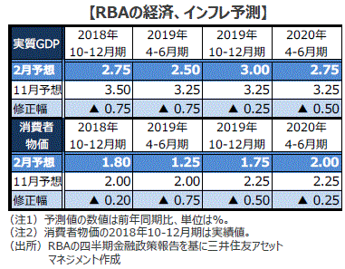 ■また、2月8日に公表されたRBAの四半期金融政策報告では、実質GDP成長率や消費者物価指数の見通しが引き下げられました。これにより、利上げ期待が後退し、豪ドルの下落要因となりました。