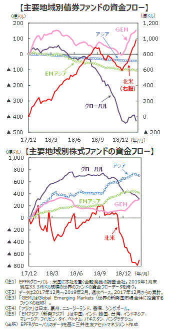 ■債券ファンドは2カ月連続で大幅な流入超でした。世界的に債券利回りが低下する中、米国の金融政策がハト派的なスタンスに転換したことが背景です。
