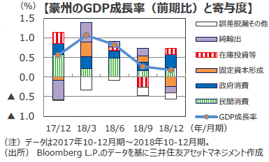 ■3月6日に公表された2018年10-12月期の豪州の実質GDP成長率は前期比+0.2%となり、前期の同+0.3%や市場予想の同+0.3%を下回りました。個人消費が低迷しているほか、輸出の減少により純輸出が4四半期ぶりにマイナスとなりました。