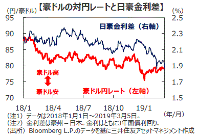 ■実質GDP成長率が市場予想を下回ったことを受けて、豪ドルはやや下落しています。世界経済の緩慢な成長の背景にあると考えられる米中貿易摩擦では、関税引き上げが延期されました。また、中国は全国人民代表大会で大型減税など景気対策を発表しており、今後、景気は持ち直すと見込まれます。これらは豪ドル相場を下支えすると見られます。