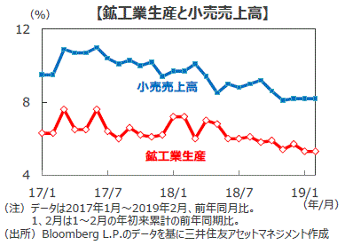 ■1~2月の鉱工業生産は前年同期比+5.3%と市場予想(同+5.6%)を下回り、昨年12月(前年同月比+5.7%)から伸び率が縮小しました。携帯端末や自動車などの生産が低迷しました。米国との貿易紛争の影響で輸出の減少や消費不振の影響が出ている模様です。