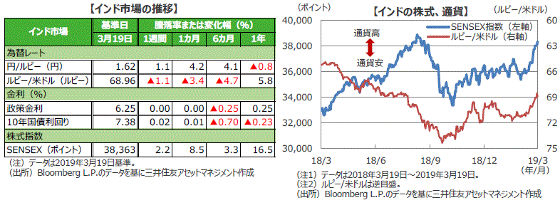 ■インドの総選挙は、各選挙区で投票日が異なり、4月11日から5月19日の間に7回に分けて実施され、5月23日に一斉開票される日程です。このため当面は世論調査などの選挙情勢が株式相場の材料として注目されそうです。ただ、インド経済が高成長を続けるとみられることや、海外からインド市場へ資金が流入していることから、株式市場は堅調地合いが続くことが期待されます。