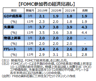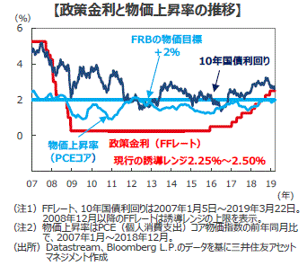 ■今回のFOMCでは、参加メンバーが想定する2019年の利上げ回数が、前回2018年12月時点の2回から、0回へと引き下げられました。インフレ期待が高まらないため、利上げは実質的に打ち止めになったと考えることができそうです。