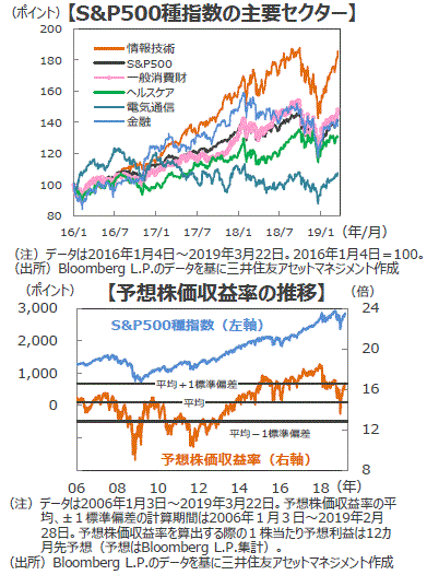 ■今年に入っての株価回復は顕著となりました。底値から3月22日までの戻りはS&P500種指数で+19.1%です。予想株価収益率も大きく上昇し、S&P500種指数は一時16.6倍と、割高を判断する一つの尺度としての平均+1標準偏差(16.5倍)を上回りました。足元では16.3倍と依然として、割安感に欠けています。
