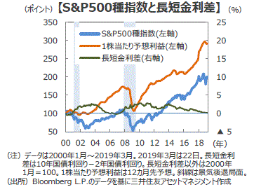 ■米国株式市場は、米中貿易摩擦の長期化などから景気が後退局面入りするのではないかとの懸念を背景に、上値の重い展開となりそうです。景気の先行きを判断するうえで、長短金利差も引き続き意識されると思われます。2000年以降の景気後退局面では先に長短金利が逆転していますが、その後、業績が悪化しています。長短金利差と同時に業績見通しが持ち直すことができるかに注目する必要があります。