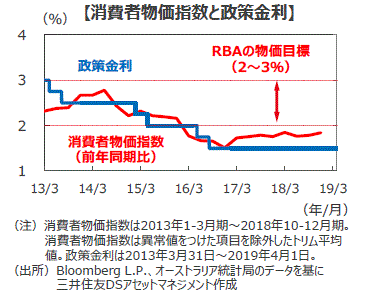■一方で、先月発表された2018年10-12月期の実質GDP成長率は前期比+0.2%と減速しました。これは、可処分所得の長期的な低迷と住宅市場の調整の影響により、消費が弱いと見られるほか、一部の地域で発生している干ばつの影響も指摘されています。ただし、公共投資や民間投資の増加によって豪州の経済成長は下支えされているとRBAは見ています。