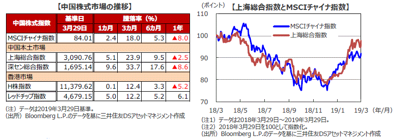 ■3月の中国株式市場は続伸しました。5日から開催された全国人民代表大会(全人代)で発表された、大規模減税やインフラ投資拡大などの景気対策が好感されました。また、米中貿易協議の進展期待に加え、李克強首相による金融緩和拡大を示唆する発言なども好感されました。さらに、米連邦準備制度理事会(FRB)が利上げを見送る見通しを示したことで、グローバルなリスクオン(選好)が強まり、新興国への資金流入期待が高まったことも支えとなったとみられます。