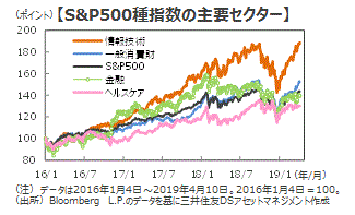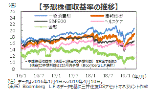 ■予想株価収益率を見ると、S&P500種指数は16.8倍と2016年以降の平均値(16.8倍)と同じです(4月10日)。ここまでの好調さをけん引した「情報技術」は19.0倍と平均+1標準偏差の18.2倍を上回っています。また、時価総額比率上位の「ヘルスケア」は15.6倍(平均値15.6倍)、「金融」は11.6倍(平均値13.1倍)と過去の水準に比べて割高感はなく、水準訂正の余地があると考えられます。