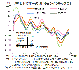 ■米国株式市場は、業績の回復期待が株価をけん引すると思われます。今後、主要企業の1-3月期決算の発表が本格化します。業績予想の勢い(モメンタム)を見るリビジョンインデックスは、1月を底に上昇傾向にあります。特に「情報技術」は堅調で、株価上昇の裏付けとなっています。「ヘルスケア」も戻りに勢いがあります。「金融」は、長短金利が一時逆転したことが嫌気され、足元でモメンタムが悪化しています。しかし、金融政策の緩和方向への転換は住宅や建設投資などを刺激することで景気をサポートすると期待され、年後半に向け業績の改善が期待されます。また、中国の金融業界の対外開放が進み始めたことも、米金融業界にプラスに作用する可能性があり、注目されます。