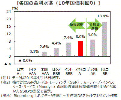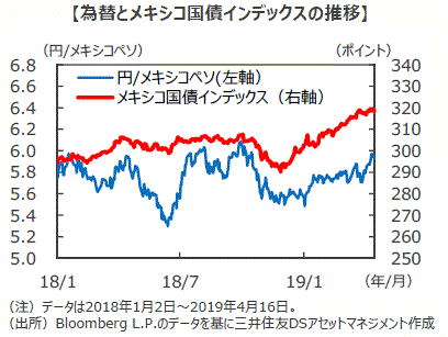 ■2019年に入りメキシコ国債は堅調に推移しています。1月以降、米連邦準備制度理事会(FRB)の金融引き締め姿勢が後退し、3月には年内の利上げを見送ることが明確になったことなどから投資家のリスク選好度が高まり、新興国に資金が流入していることが背景とみられます。