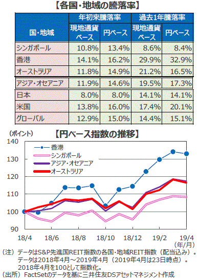 ■19年1月~4月(23日まで)のアジア・オセアニアのリート市場は以下の3市場ともに現地通貨ベースおよび円ベースで上昇しています。