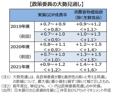 ■景気については「緩やかに拡大している」との認識を示しましたが、成長率見通しは19年度0.8%、20年度0.9%と、前回1月からそれぞれ0.1%引き下げました。今回初めて示された21年度は1.2%としました。