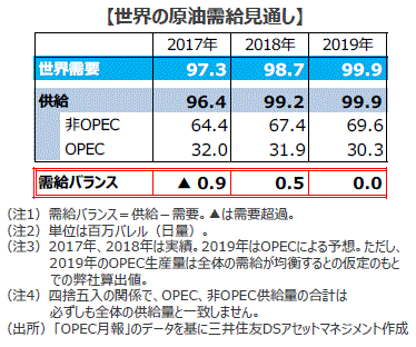 ■2019年の原油需要見通しは、全世界で前年比+1.2%の日量9,991万バレルと予想されています。需給が均衡するにはOPEC加盟国で3,030万バレルの供給が必要と見られ、現状程度の産油量が続くならば、今年は需要が供給をやや上回りそうです。