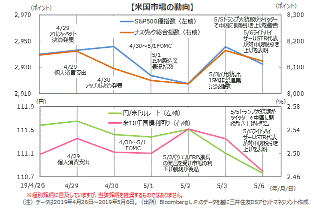 ■週明けの5月6日は、5日にトランプ大統領が、中国からの輸入品2,000億米ドル相当に対する追加関税を現行の10%から10日以降25%へ引き上げる考えをツイッターへの投稿で表明しました。また、6日にライトハイザー米通商代表部(USTR)代表も10日に対中関税を引き上げる考えを表明したことから、米中貿易摩擦懸念が再燃し、株式市場は下落、債券市場は利回りが大きく低下、円高も進行しました。
