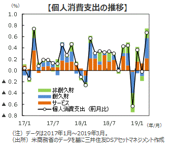 ■4月29日に発表された2月、3月の実質個人消費支出は、2月分が前月比▲0.0%と昨年12月以降の軟調さを引きずる結果でしたが、3月分が同+0.7%と大幅な上振れとなり、それまでのマイナス分を相殺する内容でした。雇用情勢は安定しており、金融市場の動揺も一巡していると思われることから、消費活動は概ね安定を取り戻したと言えそうです。年末年始の消費悪化は、政府閉鎖や悪天候、株式市場の大幅下落といった金融市場の混乱などを背景とした一時的なものであった公算が大きいと考えられます。