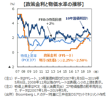 ■今回のFOMC会合のポイントは、パウエルFRB議長が性急な利下げの可能性を否定したことと考えられます。議長は足元のコア物価の下振れを一時的な変動によるものと説明し、仮に継続的な下振れとなれば考慮するが、現時点では政策金利を上にも下にも動かす証拠がなく、現行の政策金利水準は適切である、と繰り返しました。