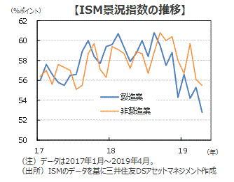 ■4月のISM製造業景況指数は52.8と3月の55.3からやや大きめの低下となりました。これまでの生産調整を踏まえると、それほど意外な結果ではないと考えられます。中国の景況感の悪化を発端とするグローバルの景気循環の悪化が、米国の生産調整につながり、雇用や設備投資にも部分的に波及したと考えられるためです。