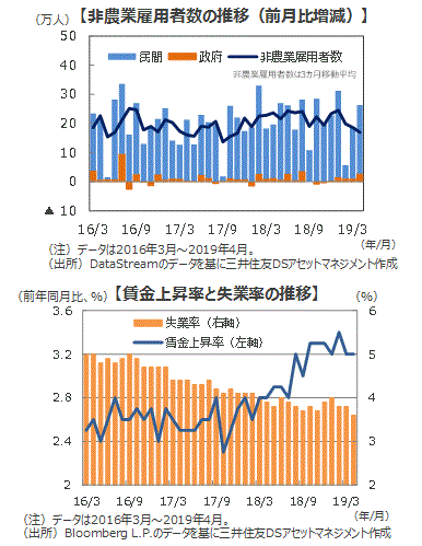 ■4月の非農業部門雇用者数は前月比26.3万人増となり、ブルームバーグ集計による市場予想の19万人増を大きく上回る増加となりました。建設業や教養・娯楽業などが伸びており、雇用統計の調査週の気温が平年比で高めだったことなどが影響している可能性も指摘されています。6カ月平均は20.7万人増と、米国景気が堅調であることが示唆されました。また、4月の失業率は3.6%と49年ぶりの低水準となりました。