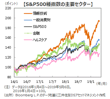 ■リフィニティブによれば、5月6日現在、S&P500社のうち392社が1-3月期の決算発表を終え、約75%の企業の収益が予想を上回りました。1-3月期の収益予想は4月23日時点で前年同期比▲1.3%でしたが、5月6日時点で同+0.9%に転じました。「一般消費財」が同▲2.9%から同+7.2%へ大幅に上方修正されたのが主因です。S&P500種指数は4月30日に史上最高値を更新しましたが、「情報技術」は4月23日に、「一般消費財」も4月26日に史上最高値を更新しました。11セクター中9セクターが上方修正で、「電気通信」(同▲4.6%→同▲10.8%)と「公益事業」(▲0.5%→▲1.2%)が下方修正となりました。続く2020年は、S&P500社ベースで2桁の増益が予想されています。