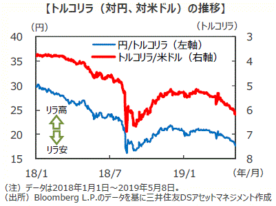 ■トルコリラは2018年に対米関係の悪化から大きく下落した後(トルコショック)、回復傾向にありました。しかし、本年3月下旬には外貨準備高の大幅減少をきっかけに不安定な動きとなり、トルコリラは下落基調に転じました。