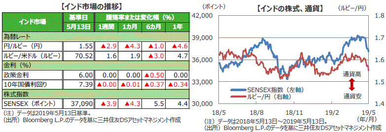 ■米中貿易摩擦は先行きが見通しにくく、当面は相場の重石となるものの、株式市場は既に約2カ月ぶりの安値水準に調整しており、世界的に景気減速懸念が高まるなか、市場では追加的な金融緩和期待が根強いことが、今後市場を支えそうです。注目される5月23日開票予定の総選挙結果で、第二次モディ政権の発足が確定すれば市場の安心材料となることが期待されます。