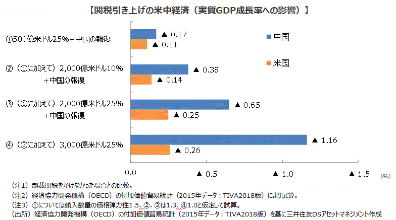 ■こうしたシナリオについて第一のリスクは米中交渉の展開そのものです。全面衝突型の展開になり、米国が中国からの輸入品すべてに25%(今回の手続きで定められている上限)の関税をかけた場合は、中国経済にはさらに▲0.5~0.6%の悪化要因となる他、設備投資を通じた間接的な影響も2~3倍に拡大するとみられ、金融市場の反応も厳しいものになるでしょう。確率は低いですが、逆にG20サミットに向けて歩み寄りが見られた場合は、今回市場が織り込んだ悪影響への懸念が消えることになります。