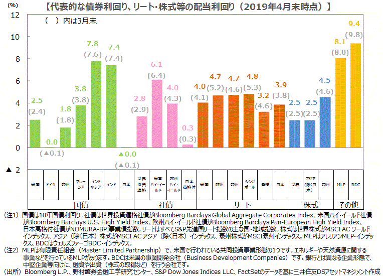 ■4月の国債利回りは、米国、ドイツ、インドネシアが前月比で上昇しました。豪州、インド等の国債利回りは横ばいでした。世界的に金融政策が緩和方向へシフトする中、より高い利回りを求める投資姿勢の強まりから高利回り社債へ資金が流入しました。資金流入が続いた世界投資適格社債、米欧のハイ・イールド債は利回りが低下しました。