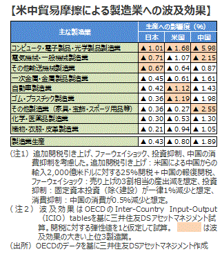 ■米中貿易摩擦による世界生産への影響は大きなものとなりそうです。ここでは製造業の生産への波及効果を、①追加関税引き上げ、②中国通信機器最大手のファーウェイに対する制裁、③世界の投資抑制、④中国の消費抑制、を条件に試算しました。結果は、世界全体で▲0.9%生産が抑制されるとなりました(①▲0.4%、②▲0.2%、③▲0.3%、④▲0.04%)。世界生産の過去10年間の平均成長率が+6.5%ですので、成長の大きな阻害要因と言えます。日本は、中国や米国に比べれば影響は限定的ですが、コンピュータ・電子製品・光学製品製造業や電気機械・一般機械製造業には相対的に大きなマイナス要因で、売り上げの減少や減益の要因として注意が必要です。
