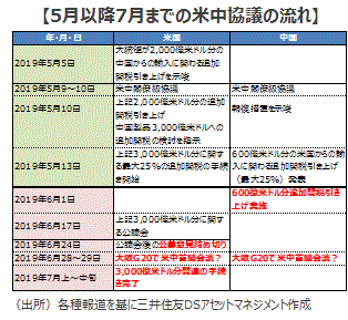 ■米中協議の山場は7月以降と思われます。米国では7月の上旬から中旬にかけて、中国からの輸入3,000億米ドル分の追加関税手続きが完了すると見られます。これが発動されれば、大統領選挙が実施される来年前半に米景気が失速するリスクがあり、トランプ大統領もその前に一応の決着をつける必要がありそうです。一方、中国は雇用環境が悪化するようなことがあれば、強硬な対米方針を変更せざるをえなくなる可能性があります。中国側も10月1日に国慶節を控え、米国と何らかの合意を目指すと考えられます。合意が形成されれば市場には大きなプラス要因になると期待されます。