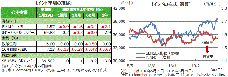 ■5月のインド株式市場は、米中貿易摩擦の激化懸念から月前半に急落しましたが、注目された5年に一度の総選挙で与党勝利の見方が強まったことから急反発しました。20日には与党連合が過半数を獲得するとの出口調査を受けて、主要株価指数のSENSEXが過去最高値を更新しました。23日の開票では、予想を上回る与党圧勝の見通しが伝わると、SENSEX指数は取引時間中に、一時初めて40,000ポイントを超えました。その後利食いに押されたものの、月末にかけてジリ高となり、28日に引け値ベースの最高値を再び更新しました。5月のパフォーマンスをみると、モディ首相の選挙公約である大型インフラ投資への期待などから、インフラ関連銘柄や金融銘柄がSENSEX指数の上昇をけん引しました。