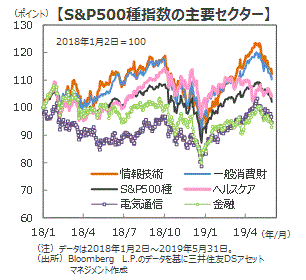 ■米国株式市場は、米中貿易摩擦の再燃に加え、トランプ大統領がメキシコに追加関税を課す方針を示したことで貿易摩擦の拡大が警戒されたほか、中国製造業購買担当者景気指数(PMI)の悪化、原油価格の下落、長短金利の逆転などの要因が重なって下落に拍車がかかりました。年初来高値から5月31日までの下落率はS&P500種指数が▲6.6%、主要セクターの年初来高値からの下落率は「情報技術」が▲9.1%、「電気通信」が▲8.4%、「一般消費財」が▲8.2%、「金融」が▲7.5%となりました。