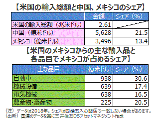 ■米国の輸入に占めるシェアは13.4%と中国に次いで2番目です。主要品目では自動車が約31%、農産物・畜産物が約21%と大きなシェアを占めます。関税の引き上げは、メキシコからの輸入品の価格上昇圧力につながり、販売価格に転嫁されれば米国の消費者の購買力を抑制し、転嫁されなければ、米国企業の収益を圧迫する要因となります。