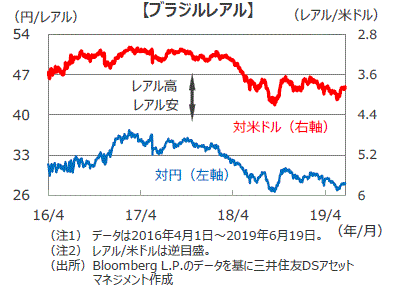 ■レアルは引き続き、年金改革法案を巡る政治的な動向や、ハト派的な姿勢を強めた米国の金融政策動向などの外部環境に左右される展開が見込まれます。但し、年金改革法案に徐々に進展がみられることや、米国など各国中銀の金融緩和姿勢を背景としたブラジルの相対的な金利の高さがレアルを支えると考えます。