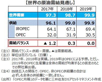 ■2019年の原油需要見通しは、全世界で前年比+1.2%の日量9,987万バレルと予想されています。需給が均衡するにはOPEC加盟国で3,052万バレルの供給が必要とみられ、現状程度の産油量が続くならば、今年は需要が供給をやや上回りそうです。