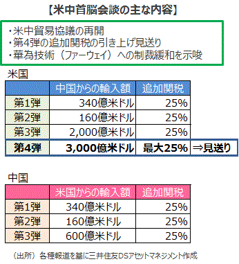 ■G20サミットで最も注目されたのが米中首脳会談でした。7カ月ぶりとなった米中首脳会談では、米中協議が再開される上、3,000億米ドルへの追加関税が猶予されることが正式に決定されました。今回の決定は妥結ではありませんが、年後半の大きな不透明材料が後退したと考えられます。交渉のスピードが加速することは見込み難いですが、ハイテク分野を巡る摩擦がさらに激化する可能性は一旦低下したと思われます。