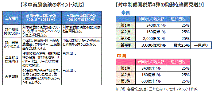 ■大阪での20カ国・地域(G20)首脳会議に際して開催された米中首脳会談(6月29日)では、米中の通商交渉の再開が合意されました。会談後、トランプ大統領が中国からの輸入品に対する追加の関税賦課を当面見送ると共に、ファーウェイに対する輸出規制を部分緩和することを示唆する一方、中国は、米国からの一部農産物の輸入を増やす方向とみられます。今回の首脳会談の結果は、昨年12月の米中首脳会談と比較して、具体的な内容が限られ、先行きには不確定な要素が多く残されました。しかし、大きな構図として米中が対立を一層激化させることを回避しようとした点は評価できます。