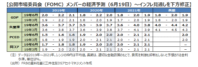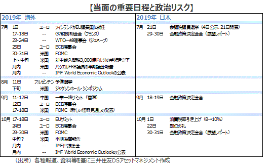 ■現在までの制裁関税の影響や、製造業を中心とする企業心理悪化・設備投資抑制を通じたダメージは、世界の実質GDP成長率を▲0.3%程度抑制しているとみられます(弊社推定)。米中首脳会談を受けて事態が悪化するリスクは低下しましたが、影響がなくなるわけではありません。弊社ではインフレ期待が低下する中で、景気の下振れリスクが増している状況を受け、米連邦準備制度理事会(FRB)は7月、9月にそれぞれ0.25%の利下げを実施、欧州中央銀行(ECB)も9月に追随すると予想しています。(1)主要国の利下げ期待を受けた長期金利低下に加え、(2)主要国の財政刺激の効果、(3)IT関連投資や耐久消費財の循環的な落ち込みの一巡などを考えると、米中対立激化に一旦歯止めがかかるとすれば、来年にかけ世界経済は持ち直す公算が大きいと思われます。世界経済成長率は今年3.3%の後、来年は3.6%に戻すと予想します。