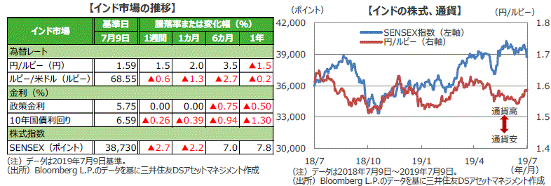■インドの主要株式指数のSENSEXは6月に前月比で小幅安となりましたが、7月もやや軟調な展開となっています。6月は米国とインドの貿易摩擦への懸念が嫌気されましたが、ポンペオ米国務長官が6月下旬にインドを訪問し、米印間の貿易問題への懸念が後退したことで月末にかけて反発しました。7月に入ると、注目された米中首脳会談での米中協議の再開合意やインド予算案への期待で上昇しましたが、7月5日に発表された予算案は市場の期待に届かず、材料出尽くしで反落しました。その後も、米雇用統計を受けた米利下げ観測の後退でアジア株が下落したこともあり、軟調に推移しています。