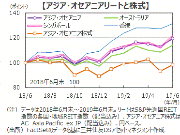 ■シンガポールは、貿易摩擦の影響を受けやすいと見られるものの、増資などによる海外への投資を通じて収益機会を獲得するリートが増えるなど、成長が期待されます。また、国内でも大規模施設の開発が今後も続くと見込まれるなど、不動産市場の拡大によるリート市場の拡大が期待されます。香港は、主力銘柄の決算が良好だったことや、国内デモの影響が軽微であると考えられることから高い分配金成長による安定的な収益の継続が見込まれます。オーストラリアでは、豪州準備銀行(RBA)が6月に続き7月の会合でも政策金利を引き下げ、さらに、年内に追加利下げが実施される可能性もあることから、相対的に利回りの高いリート市場にとって良好な環境が続くと見られます。