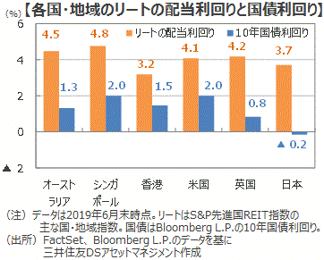■米連邦準備制度理事会(FRB)や欧州中央銀行(ECB)による利下げ期待の高まりを受けて世界的に長期金利が低下する中、相対的に利回りの高いリート市場には追い風となり資金が流入しました。配当利回りの長期金利との利回り格差は、オーストラリア、シンガポールで3%前後、香港では1.7%となっています。