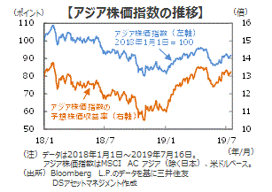 ■アジア株式市場は、米中貿易摩擦の懸念拡大から5月に調整色を強めました。その後は、6月末の20カ国・地域首脳会議(G20)で米中首脳会談が開催され、米中交渉が再開されるとの期待から値を戻しました。足元では、米中交渉が進展する見込みが薄らぐ中、上値の重い展開となっています。アジア株価指数の12カ月先予想株価収益率は7月16日に13.2倍と2006年以降の平均である12.3倍を上回っています(アジア株価指数はMSCI AC アジア(除く日本))。