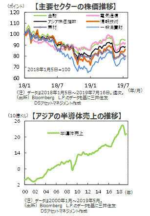 ■アジアの半導体売り上げは、2018年8月をピークに低下基調にありますが、足元で低下に歯止めがかかりはじめました。もっとも、米中貿易摩擦の先行きは依然不透明なうえ、足元では、日本が韓国向け特定品目の輸出手続きを厳格化することで韓国からの半導体の出荷が滞る可能性も懸念されており、半導体を巡る環境は予断を許しません。ただ、調整からほぼ1年が経ち、半導体サイクルが底入れする可能性は高まっていると考えられます。